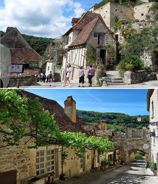 Главной особенностью, «самой любимой деревни французов» является ее месторасположение – она в прямом смысле слова врезана в 150-метровую скалу, возвышающуюся над притоком реки Дордонь с видом на каньон Алзу. Лучше всего о том, как выглядит трехуровневое поселение, подытоживает старинная поговорка: «Дома на реке, церкви на домах, скалы на церквях, замок на скале». И это действительно так. Первый уровень, расположенный над скалистым берегом реки, является непосредственно поселением, в котором издревле жили люди (сейчас проживает около 600 человек, а посетителей бывает до полутора миллиона в год). Второй уровень – это «религиозный пояс», «место 8 святынь», где в разное время были построены одни из самых притягательных культовых сооружений Франции. А вот над ними, на самой на вершине скалы, возвышается средневековый замок.