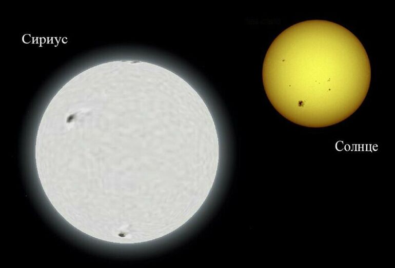Ярчайшая звезда на ночном небосклоне. Её возраст около 250 млн. лет. Сириус виден почти повсюду, если наблюдать его с Земли. Расстояние от Земли до Сириуса 8,5 световых лет. Это светило вдвое больше нашего Солнца и в 25 раз ярче. Радиус равен 1,2 млн. км, что на 71% больше радиуса Солнца. Температура поверхности составляет приблизительно 9 700 градусов.