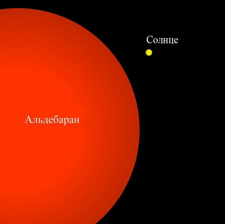 Альдебаран - оранжевая гигантская звезда, расположенная примерно в 65 световых годах от созвездия Тельца. Альдебаран в 45 раз больше нашего Солнца, радиус которого составляет около 30 740 000 км. Температура поверхности составляет приблизительно 3 700 градусов. Альдебаран светит с 425-кратным свечением Солнца.