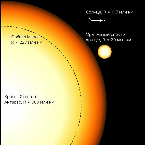 Антарес - самая яркая звезда в созвездии Скорпиона, В 850 раз больше нашего Солнца по радиусу и в 12 раз массивней его. Светимость в 57 500 раз больше. Поместите её в центр нашей Солнечной системы, и она достигнет Марса. Расстояние от Земли составляет 600 световых лет. В ближайшие несколько миллионов лет взорвётся как сверхновая. Температура поверхности составляет приблизительно 18 500 градусов.