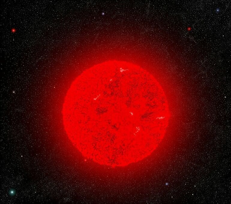 Бетельгейзе - красный сверхгигант, являющийся девятой ярчайшей звездой на ночном небе (самая яркая звезда на небе - Сириус), и второй ярчайшей звездой в созвездии Ориона. Эта звезда находится на расстоянии 650 световых лет от Земли, в 80 000 раз ярче и в 20 раз больше массы нашего Солнца. Радиус Бетельгейзе составляет около 820 700 000 км. Ожидается, что красные сверхгиганты, имеющие такой же размер, как и Бетельгейзе, скоро закончат свою жизнь, так как быстро сжигают своё топливо. Температура поверхности составляет около 3600 градусов.