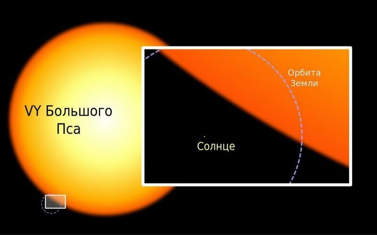 VY Большого Пса – Этот красный гипергигант находится в созвездии Большого пса, далеко оставив позади своих конкурентов. Это самая крупная звезда по размеру известная учёным. Её радиус превосходит Земной в 1800 раз! И составляет 25 масс нашего Солнца. По яркости ей тоже нет равных, она 270 000 раз ярче нашего светила. Если поместить этого гиганта вместо нашего Солнца, то при таком размере она достигла бы орбиты Сатурна! VY Большого Пса находится на расстоянии 5 000 световых лет.