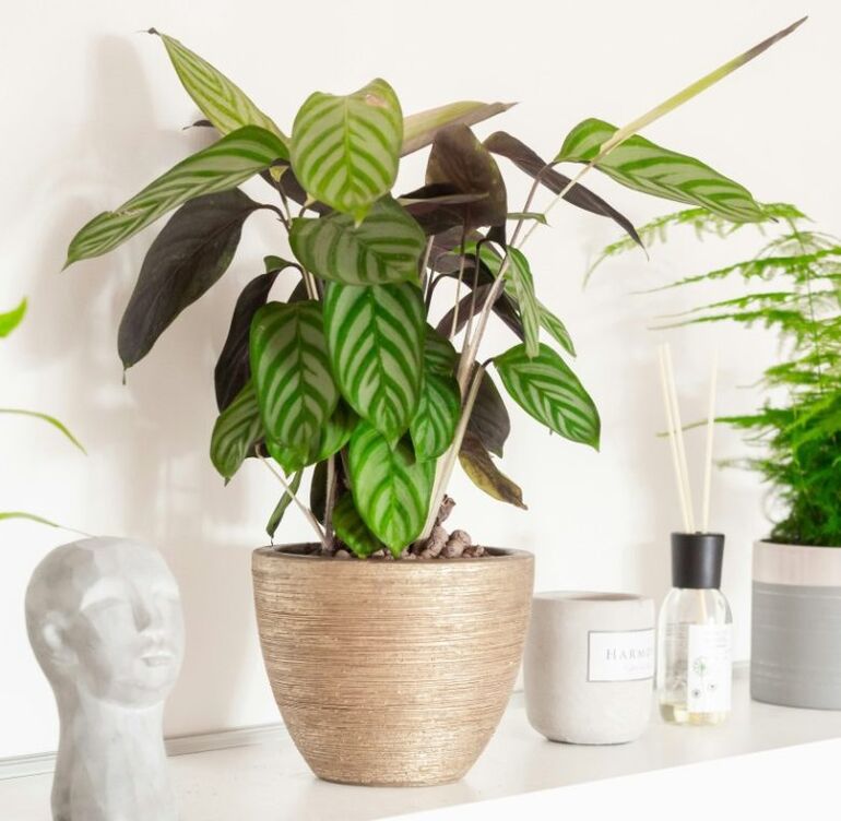Если тебе нужно растение, которое не просто «вписывается», а создает эффект «вау», то это калатея. Ее листья с необычными узорами будто специально созданы для того, чтобы завораживать. Это идеальный выбор для тех, кто хочет добавить в интерьер чуть больше текстур и орнаментов. Калатея отлично будет смотреться в спальне или зоне для отдыха, где ее живые оттенки зеленого и фиолетового добавят спокойствия и гармонии.