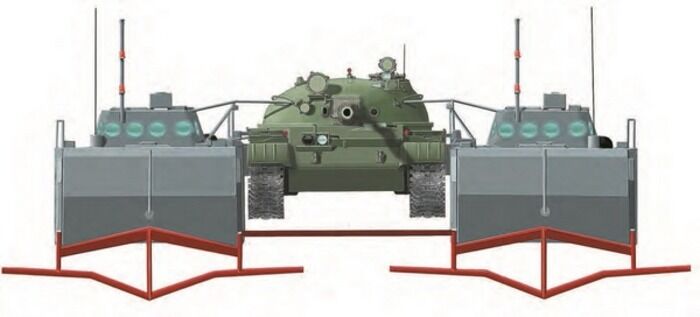 С конструктивной точки зрения система скоростного танкодесантного плавсредства представляла собой два катера, которые устанавливались по бокам танка по аналогии с немоторными понтонами. Каждый катер был оснащён двумя гидроцилиндрами, которые приподнимали конструкцию над землей, пока она не входила в воду до определенной осадки. А во время движения подводные крылья на катерах поднимались, а в передней и задней части танка устанавливались крылья-стяжки, которые также были подняты и прижимались к борту.