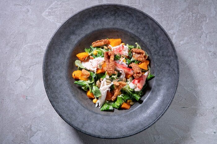 Далеко не все знают, но тыквенная мякоть прекрасно комбинируется с морепродуктами, особенно с крабами и креветками, у которых тоже сладковатый привкус. Если вы используете в классическом крабовом салате не рис или картофель, а мякоть тыквы, вы будете в шоке от полученного результата.