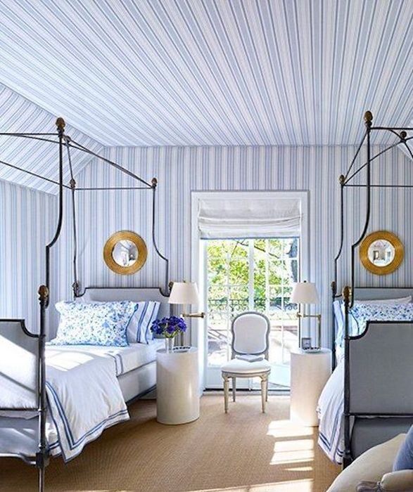 Полосы незаменимы в комнатах, где требуется зрительное увеличение пространства. Если речь идёт о вертикальных полосах, то они способны визуально приподнять низкие потолки. Очень эффектно смотрится приём, когда обои переходят со стен на потолок.
