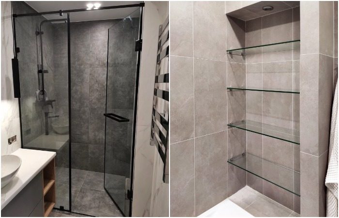 Установите стеклянную душевую кабину и повесьте прозрачные полки