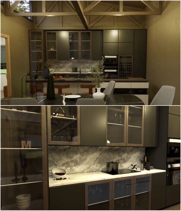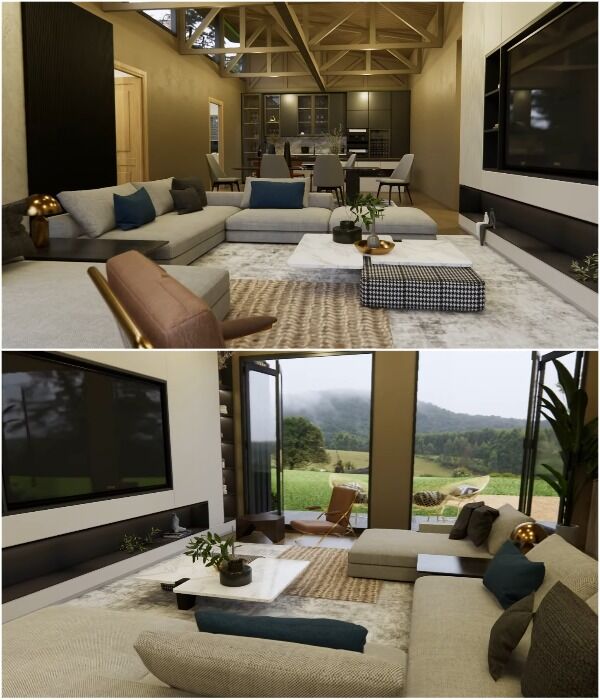 Чтобы увеличить жилое пространство и сделать общую зону более вместительной и объемной, архитекторы компании Architect TVD объединили 2 центральных контейнера. При этом подняли потолок до 4-х метровой высоты, что в тандеме с панорамными окнами, стеклянными дверями и ленточным остеклением под самой крышей сделали эту часть дома более воздушной. Соединительный блок придает дому более внушительный и величественный вид снаружи, внутри же, окна и открытая стальная балочная конструкция поддерживают индустриальную тематику дизайна.