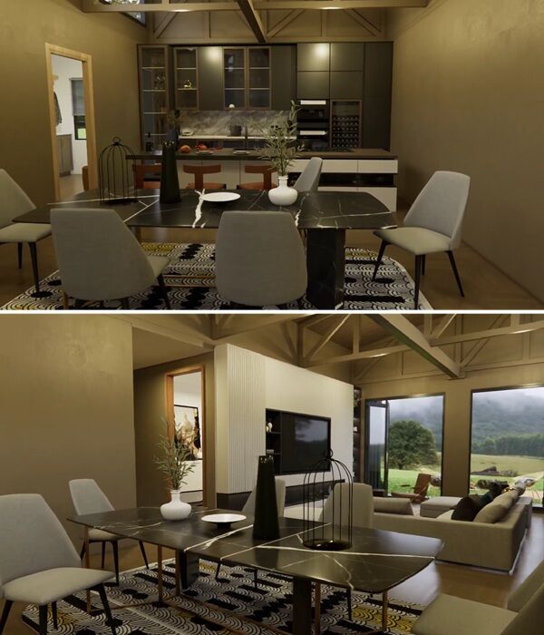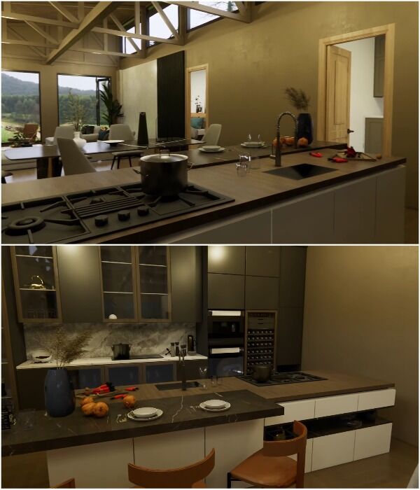 Поскольку соединительный пролет находится в центре жилища, в нем обустроили большую гостиную, столовую и кухню, плавно перетекающие друг в друга. Каждая часть общего пространства зонирована с помощью отделки, предметов мебели и соответствующей бытовой техники.
