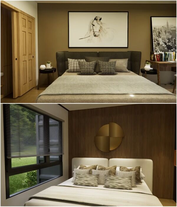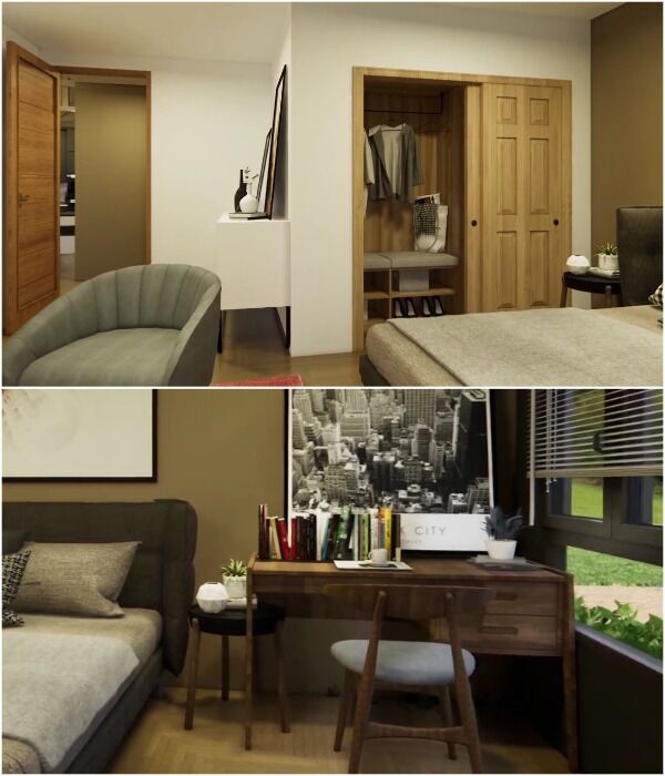 В ультрасовременном и стильном контейнерном доме обустроено сразу три отдельные спальни. В каждой из них помимо дизайнерской двуспальной кровати имеется: встроенный вещевой шкаф, идеально вписанный в дизайн интерьера; небольшая лаундж-зона и рабочий уголок. Такое наполнение позволяет жить и работать под одной крышей семье, состоящей минимум из двух поколений.
