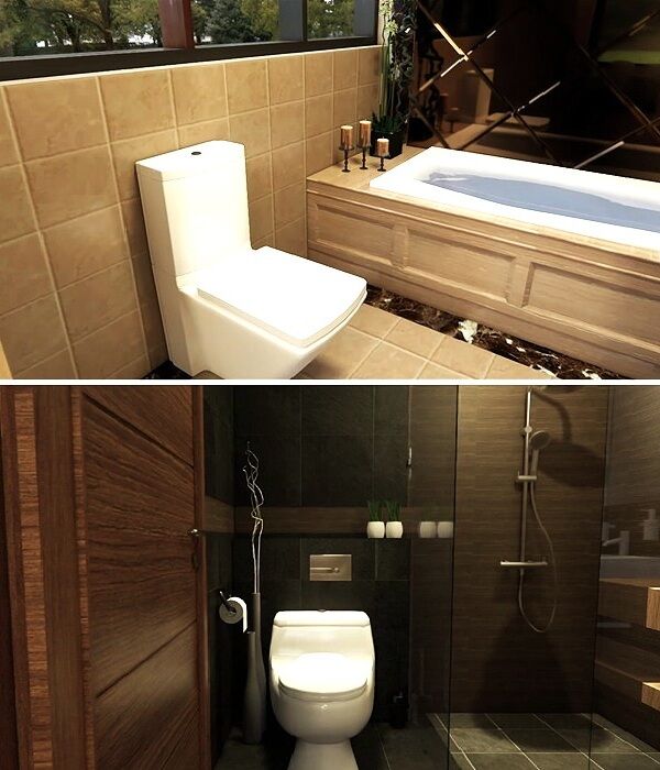 Ванные же комнаты получились не менее роскошными и функциональными. В той, что находится возле главной спальни, помимо большого туалетного стола с вместительными полками, ящиками, встроенной раковины и смывного унитаза, установлена полноразмерная ванна (имеется и душ). В другой – предусмотрены: просторная душевая, спрятанная за стеклянной перегородкой с дверью, а также традиционный набор мебели и сантехнического оборудования.