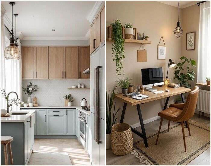 Чтобы интерьер стал уютным и тактильно приятным, добавьте керамическую посуду, льняные занавески, вязаные пледы. Освещение должно быть максимально приближенным к естественному свету, поэтому не бойтесь открывать окна и впускать солнечные лучи. Если хотите добавить квартире изюминку, обратите внимание на элементы в стиле рустик, например, необработанные материалы.