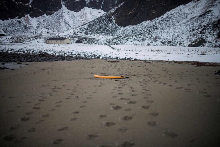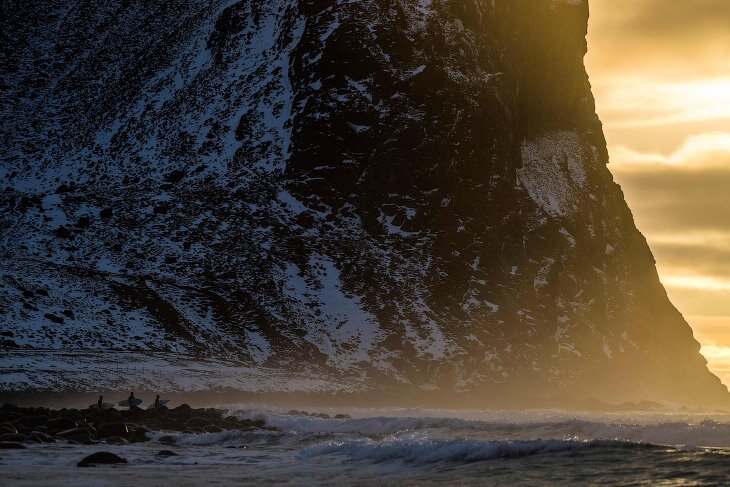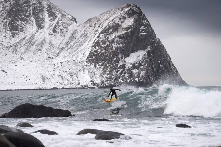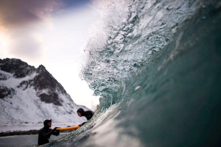 Так выглядит суровый, очень красивый арктический норвежский серфинг.