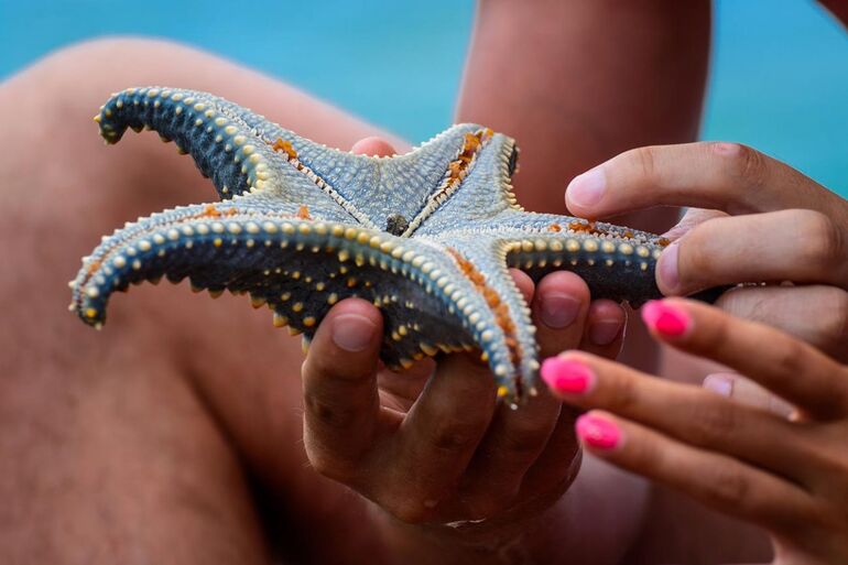 Глазные пятна звезды покрыты кожей, поэтому рассмотреть их непросто. Выглядят органы зрения, как небольшие красные или чёрные точки на кончиках «рук», которые морская звезда поднимает для изучения обстановки. Такое пятно есть на каждом луче, и это значит, что у пятиконечной звезды пять глаз, а у сорокаконечной – все 40. Однако на качестве зрения количество никак не сказывается.