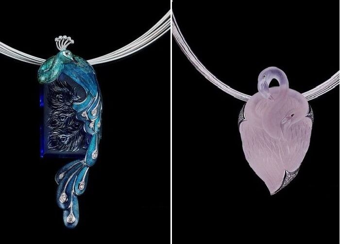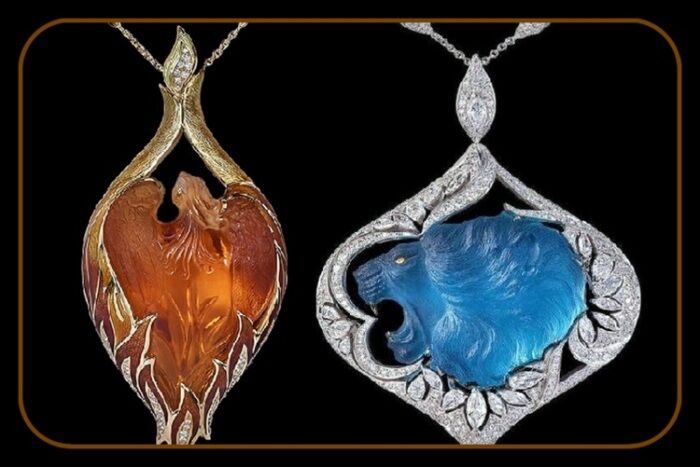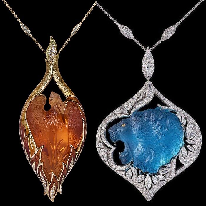 Колье «Rising Phoenix» с бразильским цитрином. / Колье «Celestial Lion» из платины и белого золота с резным аквамарином Santa Maria, желтыми сапфирами и бриллиантами. Камнерезное искусство бренда «Henn of London».