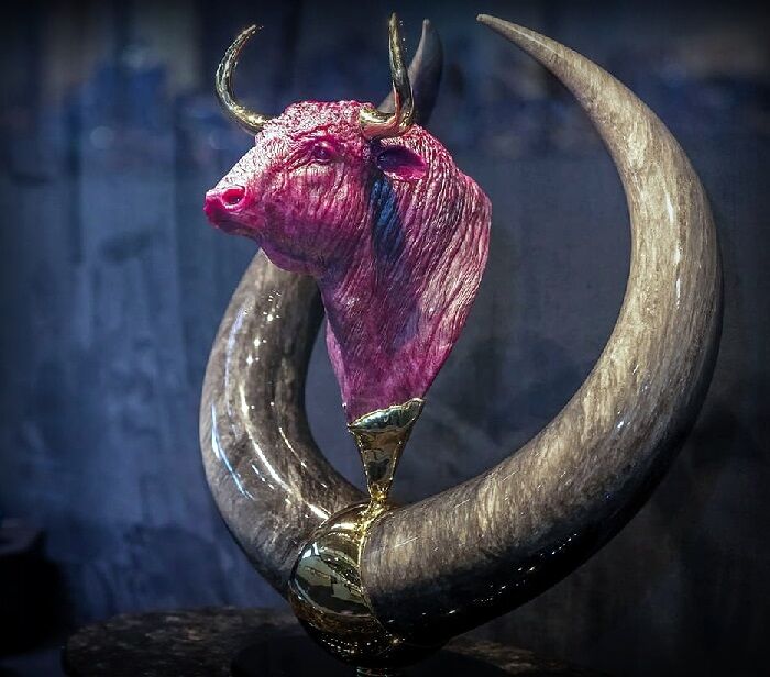 Голова быка Henn of London из желтого золота и танзанийского рубина. Камнерезное искусство бренда «Henn».