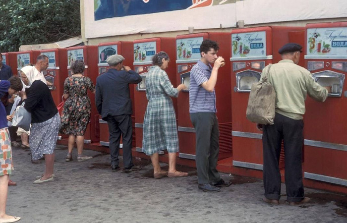 Еще одним признаком советского времени являются газированные напитки. Причем, не просто газировка в бутылка, а из автоматов. Практически на всей территории СССР стояли автоматы типа АТ-101С. Они подключались к водопроводу и электрической сети. Поэтому вода подавалась охлажденная и газированная. За один стакан такого напитка нужно было заплатить одну копейку, а вот за воду с сиропом уже три копейки. Сиропа добавлялось 20 миллилитров. Самыми популярными сиропами были «Дюшес», «Ситро», «Тархун», «Байкал», «Крем-сода».