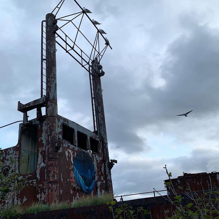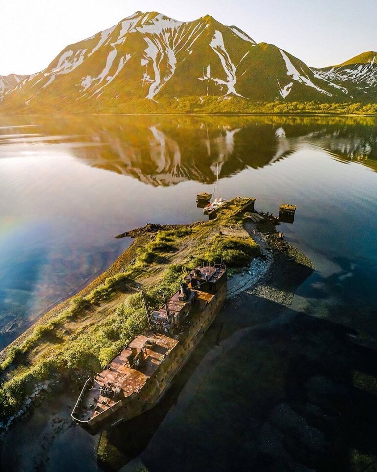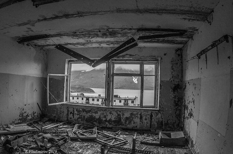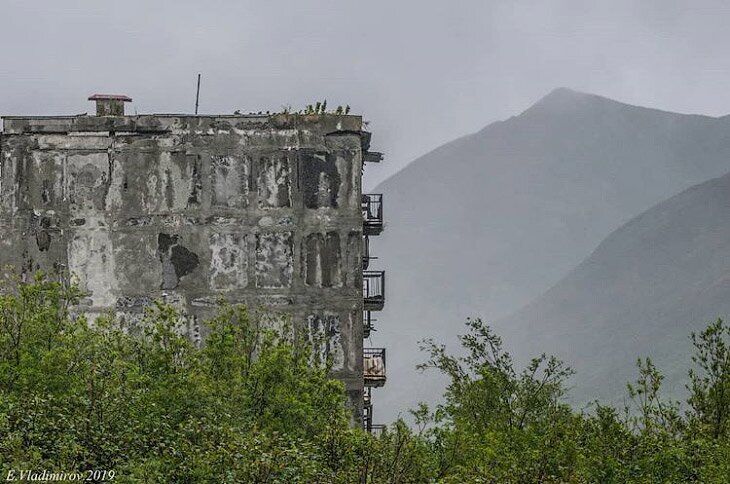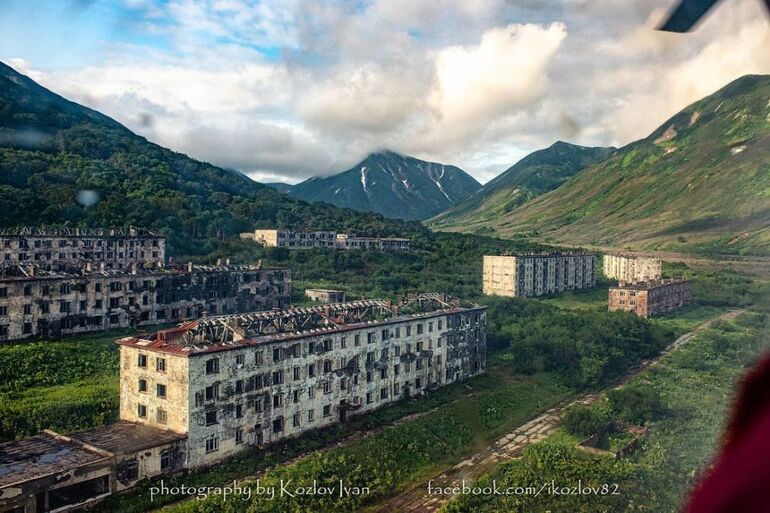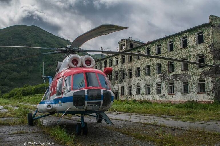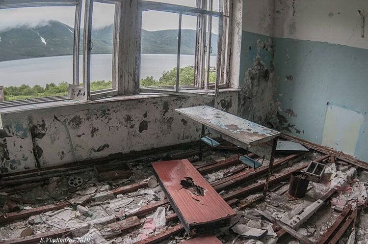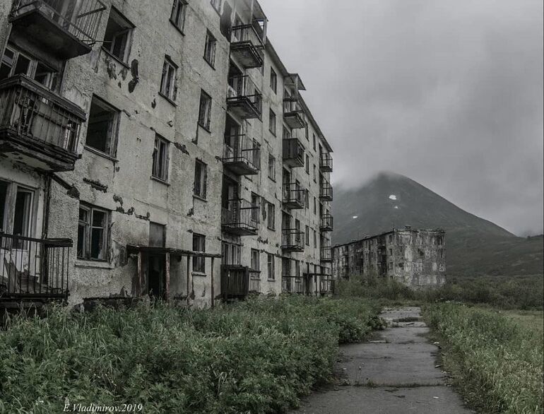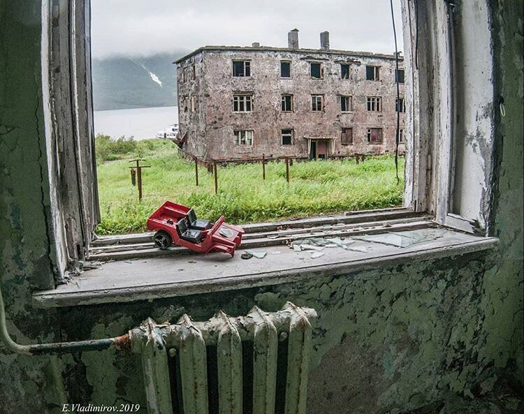 От гарнизонного поселка остались каркасы домов, старые вещи жителей и ржавеющий корабль у пристани. (Фото Instagram @ vladimirov_evgeniy_kamchatka):