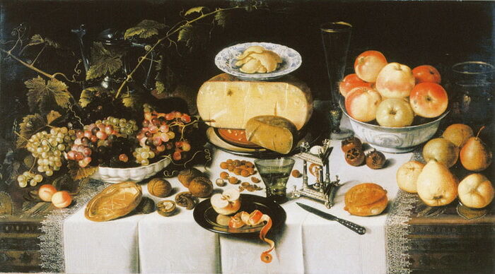 Одним из первых натюрмортов-завтраков XVII века считается картина харлемского живописца Николаса Гиллиса «Накрытый стол». Предметы на столе предстают перед зрителем под таким ракурсом, как будто на них смотрят чуть сверху. Это позволяет увидеть и разглядеть все, что находится на столе, от пирамиды с сырами до ореховых скорлупок.