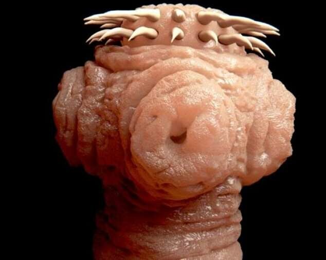 Перед вами ленточный червь солитер — на фото показана передняя часть его тела: глаза (две присоски), еще две находятся на другой стороне головы. А во рту — хитиновые крючки, через которые ленточный червь прикрепляется к стенкам тонкой кишки.