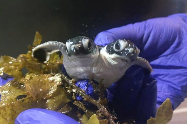 Специалисты по охране природы обнаружили только что вылупившуюся двуглавую черепашку на острове Мабул Малайского архипелага. Ученые утверждают, что ни разу не встречали такой особи среди 13 тысяч родившихся в научном центре черепах. Морской биолог Дэвид Макканн рассказал, что каждая голова дышит и реагирует на окружающую среду отдельно. «Это удивительно. Похоже, что правая голова контролирует передний правый ласт, а левая ― передний левый. При этом они способны гармонично координировать движения, чтобы передвигаться и плавать».