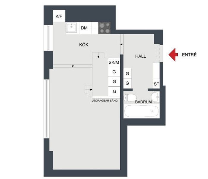 Первым преимуществом этой малогабаритки стала её планировка. По сути, это одна прямоугольная комната без стен и перегородок. Здесь практически нет прихожей, кухня объединена с остальным пространством, а ванная комната совсем крошечная. Несмотря на небольшую площадь квартиру удалось удачно зонировать.