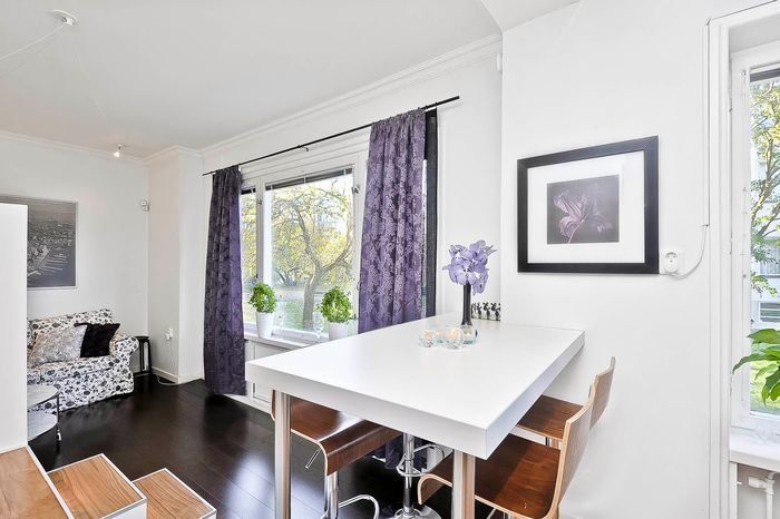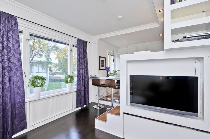 Немаловажную роль в оформлении малогабаритки играет цветовая гамма. Здесь она стандартная для маленьких пространств. Но белый гармонично разбавили вкраплениями весенних оттенков – сиреневого на шторах и зелёного, которые присутствует на комнатных растениях. Чтобы уравновесить и сбалансировать пространство, напольное покрытие для зоны гостиной выбрали в тёплом тёмном оттенке, а в кухне и прихожей отдали предпочтение светлым полам.